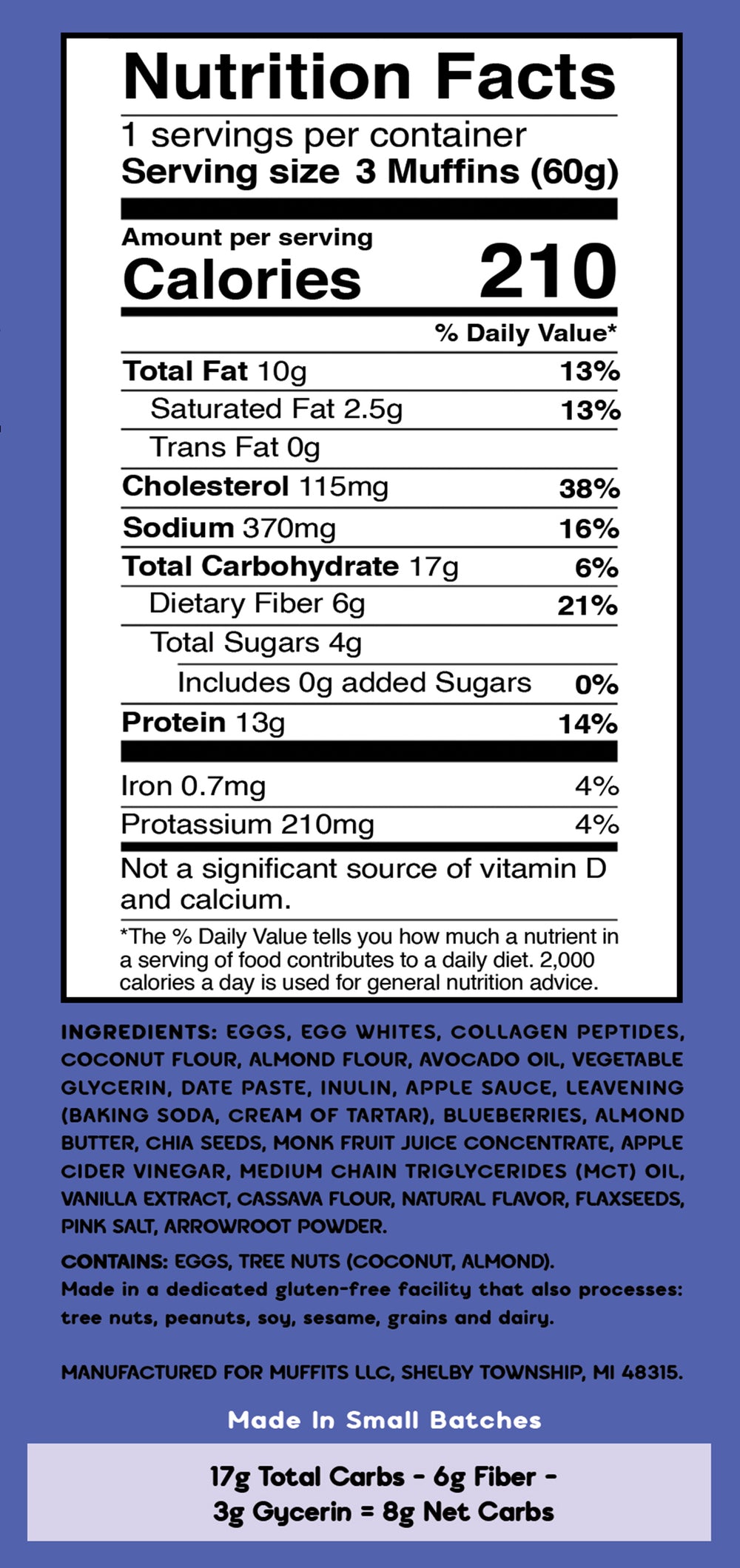 Savor the bursting flavor of our Wild Blueberry Muffits - a wholesome twist on the classic blueberry muffin. Loaded with plump wild blueberries and enriched with chia seeds, flax, and collagen, these muffins redefine breakfast indulgence. Each bite offers a perfect blend of nostalgic flavor and modern nutrition, leaving you energized and content without the guilt of typical bakery muffins.